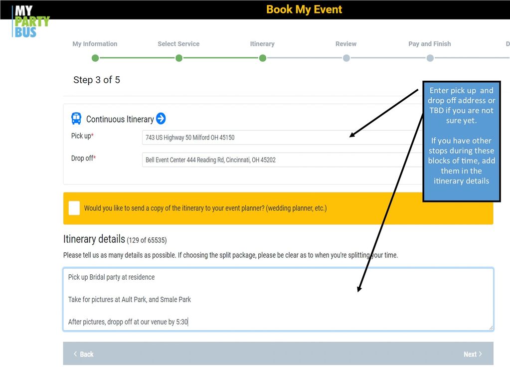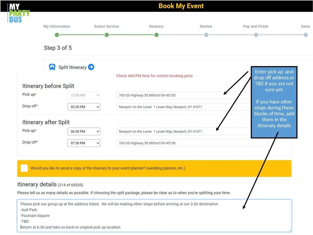 If you have not confirmed your availabilty of your bus size, date, and times, please do not continue. Proceeding without confirming, does not guarantee your reservation. You can call or text our office at 513-655-3375 or email us at Sales@MyPartyBus.com